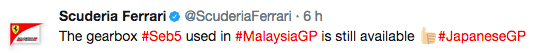 Visuellement spectaculaire, il semblerait finalement que les dégâts ne soient pas aussi conséquents que craints. Selon Ferrari, la boite de vitesses serait intacte et pourra donc être utilisée à Suzuka pour le Grand Prix du Japon, évitant ainsi une pénalité de 5 places sur la grille de départ d’un rendez-vous qui s’annonce presque comme celui de la dernière chance pour l’Allemand dans la course au titre face à Lewis Hamilton.
