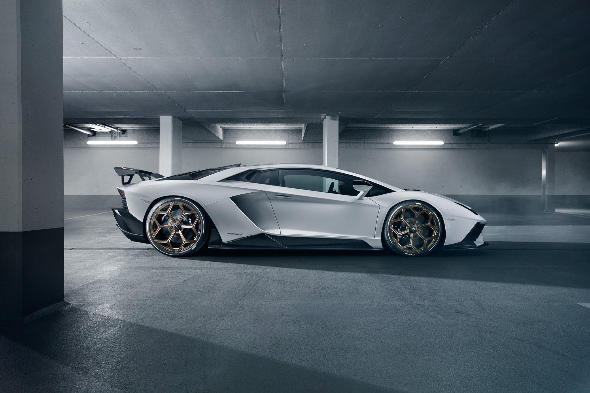 Pour la tenue de route et le style, le kit comprend également une suspension rabaissée de 30 mm et un kit aérodynamique complet. L’Aventador préparée repose sur des jantes 20 pouces pour l’avant et 21 pouces à l’arrière.