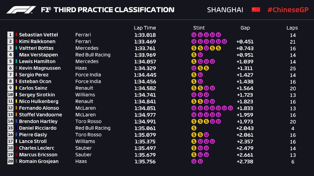Kevin Magnussen signe un bon sixième temps devant les deux Force India de Perez et Ocon. Carlos Sainz au volant de sa Renault vient se positionner en neuvième position devant un étonnant Sergey Sirotkin au volant de sa Williams.