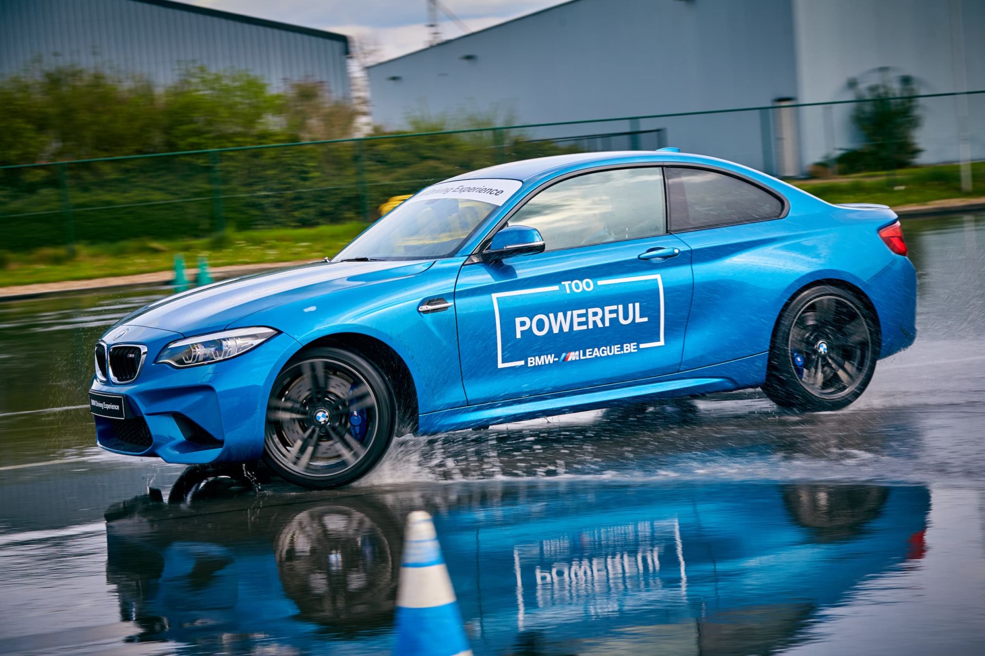 Vient ensuite l’exercice le plus excitant. Le temps de faire un petit pit-stop aux sanitaires et de manger un bout, nous repartons dans les 120d pour entamer la glisse contrôlée autour d’une rotonde. Avec les semi-slicks à l’arrière, une petite accélération sèche permet de mettre en travers la compacte. Reste ensuite à doser correctement la pédale de droite et à maîtriser le contre-braquage. En bonus, l’importateur BMW BeLux avait affrété, pour nous, la toute nouvelle BMW M2 Competition. Avec ses 410 chevaux envoyés sur les roues arrière, ici, pas besoin de pneus de course pour glisser.
