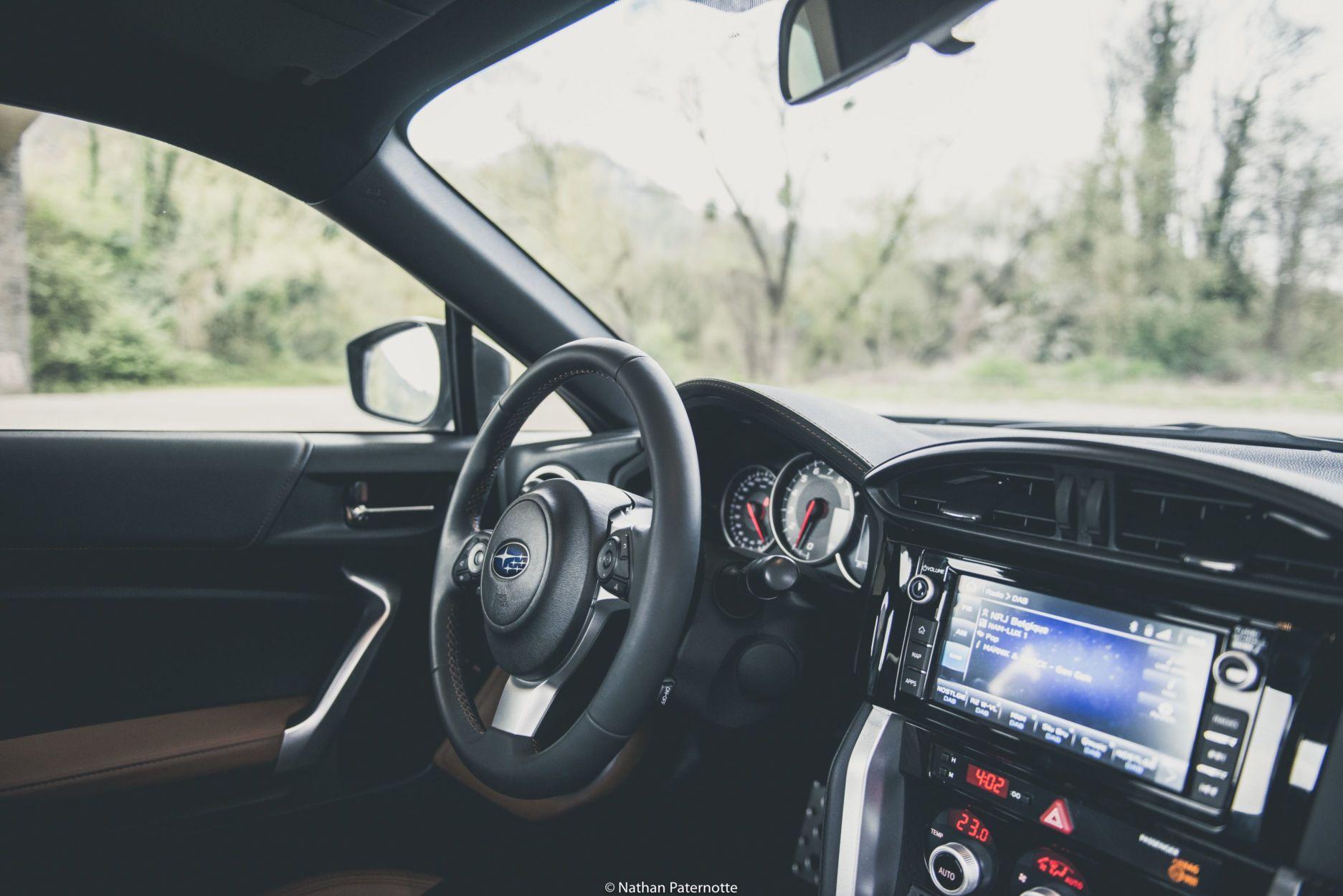 On débraye, on passe la première, en prenant soin de ne pas caler. En effet, avec une course de pédale très courte sur l’embrayage, le point de patinage demande une certaine précision pour être trouvé. Avant de rejoindre l’arrière pays, il faudra malheureusement s’accoutumer des traditionnels embouteillages dans et à l’extérieur de Bruxelles. Quoiqu’il en soit, il s’agit d’une bonne opportunité pour découvrir cette BRZ sur toutes ses faces. Avec son moteur atmo, le coupé bénéficie d’un couple suffisant presque en permanence, du moins dans le cadre d’une conduite en bon père de famille. Pour réellement déchaîner ce flat-four, il faudra entre 5.000 tours/minutes et la zone rouge, qui culmine à 7500 tours. A partir de là, la sonorité “fade” se transforme en une mélodie très plaisante. Néanmoins, à titre personnel, votre serviteur ne refuserait pas l’installation d’une ligne d’échappement plus criarde, de façon à profiter constamment d’une sonorité plus sportive.